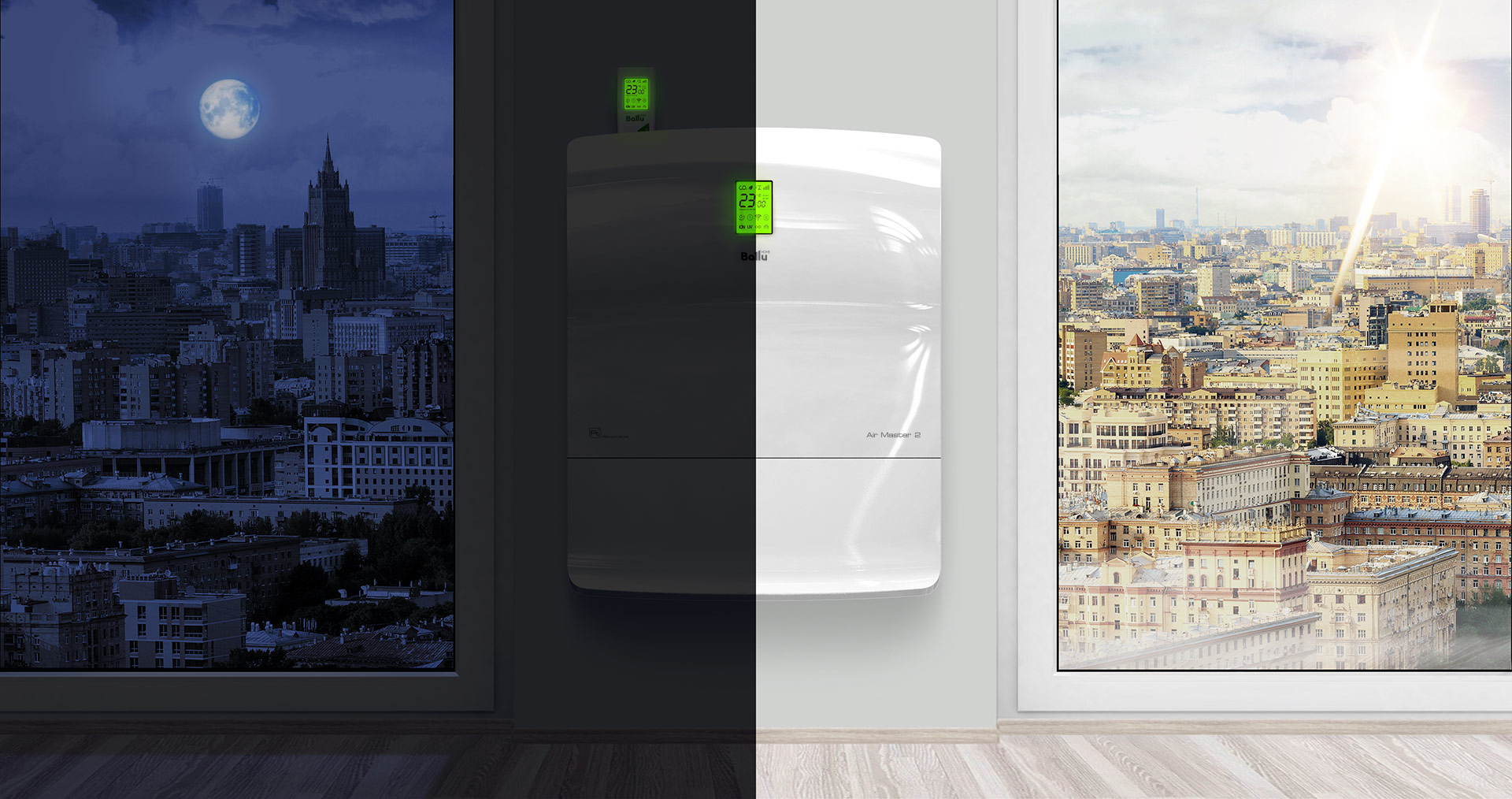 Автоматическое поддержание заданных параметров проветривания, подогрева и очистки воздуха ночью с минимальным уровнем шума и отключаемой подсветкой дисплея.